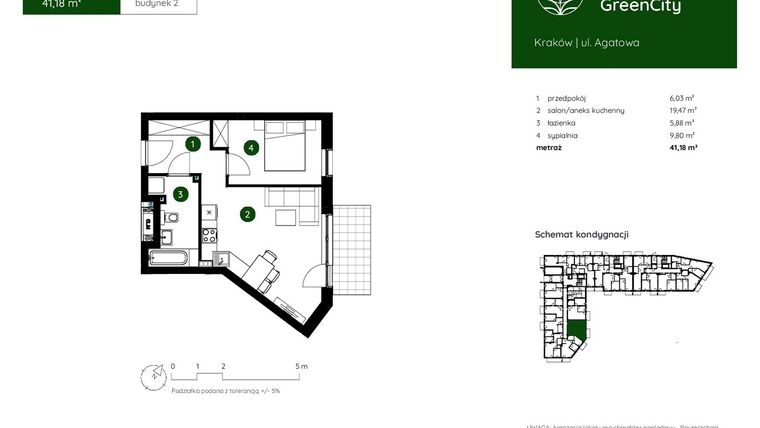 Nowe 2-pokojowe mieszkanie na sprzedaż o powierzchni 41,18 m² znajduje się w nowo budowanej inwestycji deweloperskiej Murapol GreenCity bud. 2 na Bieżanowie-Prokocimiu, ul. Agatowa (8.7 km od centrum Krakowa).