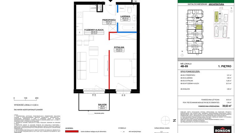 Nowe mieszkanie o oznaczeniu 4B_09 znajduje się na 1 piętrze i jest 1-poziomowe. Pomieszczenia mają od 260 do 280 centymetrów wysokości. W mieszkaniu znajdują się 2 pokoje.